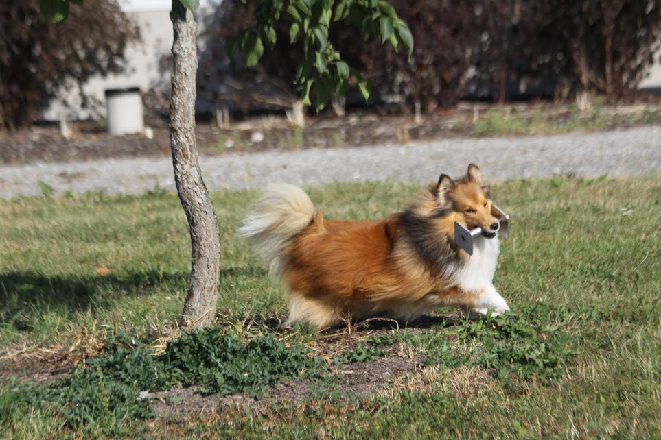 Metskuhypyssä:Jiri haki hyvin kapulan,ei yhtään ällöttänyt Jiriä:)Mutta perusasento oli vino,kokeeltiin uudestaan niin taas Jirillä oli perusasento vino:(No sen jälkeen kokeeltiin niin,että Jirillä oli kapula suussa ja lähetin Jirin kiertämään puuta,sitten sanoin sivu niin tuli suora sivulletulo:)Meidän pitää treenata niin,että tavallisella kapulalla hyppynoutoa ja sitten metallikapulalla puunkiertämistä,niin kauan että sivulle tulo on suora eikä vino.